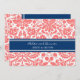 Custom rehearsal dinner party invitations in modern and elegant dark navy blue, peach orange pink and white chic and classic floral damask vintage pattern. Personalise the text to create a unique invitation for your wedding rehearsal dinner. Contact us to request a colour change. Available in many matching wedding products.