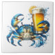 This ceramic tile is shown with a blue crab holding a beer in celebration art print.