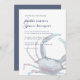 Coastal chic wedding invitation features a watercolor blue crab illustration at the lower right in faded harbour blue, with your wedding details overlaid in classic navy blue. Perfect for beach, summer, or nautical weddings, especially those set in the blue crab regions of the mid Atlantic, these coastal style wedding invitations reverse to solid harbour blue.