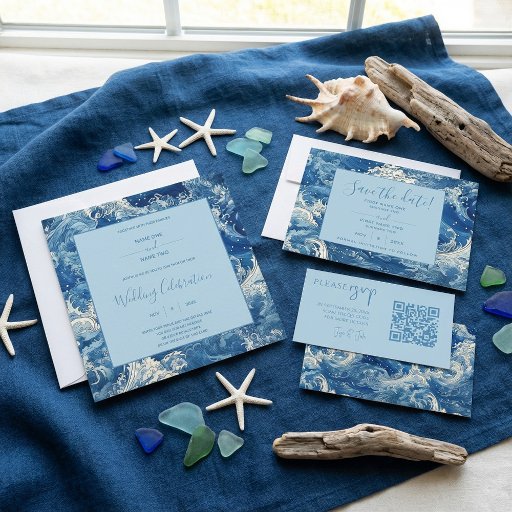 Featuring an elaborate pattern of swirling blue ocean waves in a hand-painted watercolor style. The border is richly detailed with shades of navy, cobalt, and white, while a crisp light blue frame highlights your event details in classic serif and graceful script fonts. The layout balances contemporary and traditional elements, making it ideal for beach, coastal, or nautical-themed weddings. Ample space is provided for names, date, and venue information, ensuring clarity and style for your special announcement.