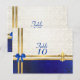 Easily personalise this traditional wedding style dark navy blue and cream vintage damask pattern with gold coloured ribbon, fleur de lys and bow table number for your special day.