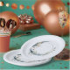Paper plates with a mystical illustration. A dark blue crescent moon with a elegant thin circle outline and white flower blossoms along its edges.