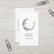 Business card with a mystical illustration. A dark blue crescent moon with a elegant thin circle outline and white flower blossoms along its edges.
