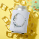 A can cooler with a mystical illustration. A dark blue crescent moon with a elegant thin circle outline and white flower blossoms along its edges.