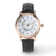 A watch with a mystical illustration. A dark blue crescent moon with a elegant thin circle outline and white flower blossoms along its edges.
