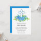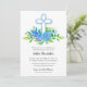 A blue and white cross accented with greenery and flowers in shades of blue, is perfect for boy First Communion, Christening, Baptism, or Dedication invitations. Also available in pink.