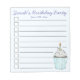 List-style shopping checklist note pad design features an original marker illustration of a cupcake topped with sprinkles and a candle, printed on a blue background. Just personalise with your birthday party information for a fun favour.