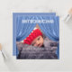 Adorable baby birth announcement features blue and white silky looking stage curtains open up to introduce your newest arrival. At the top of the curtain is the word INTRODUCING in bold white vanity light font. There is a place to add a photo of your new baby. There is customisable text in white font where you can add your new baby's name, date of birth, time of birth and birth weight. The reverse side of the baby birth announcement is solid blue.