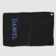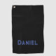 Blue custom name on black golf towel
