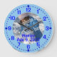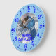 The clock has blue dots for the minutes and hours, and blue numbers, on a lighter blue background.