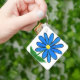 Whimsical blue daisy with yellow centre and green leaves against white background. Blue Monogram on backside with black geometric sqaure. Designed for Aluminium Square style.