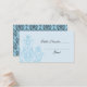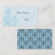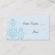 These guest seating assignment cards feature a black formal damask pattern on a light blue background. There is space for a table number and guest name on the front. You can add, remove and customise the text on the product order page.