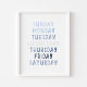 The "Blue Days of the Week Educational Poster" is a visually appealing and educational resource designed to teach the days of the week to young learners. This poster features a pleasing blue colour scheme that creates a calming and inviting atmosphere. With clear and easy-to-read text, it helps children develop an understanding of the days of the week and their sequence. This educational poster is ideal for classrooms, homeschooling, and playrooms. The blue colour scheme adds a touch of visual interest while enhancing the overall learning experience.