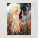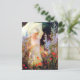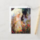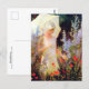 A fine art postcard with the painting by the American artist Charles Courtney Curran (1861-1942), titled Blue Delphiniums. A woman dressed in white with a parasol admiring the garden of blue and red flowers.