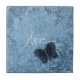 Sweet denim blue jeans look with indigo butterfly perched on floral rose background with romantic scrolls and flourishes. The word Love is handwritten in white across the design