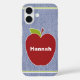 Whimsical teacher's iPhone case, done in graphics that look like blue jean denim. Colourful graphics of a big red apple, in the middle, and colourful lines border the top and bottom. White custom text, on the large apple is ready to personalise to read anything you want.