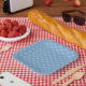 Blue Dew Drop Style Paper Plates to go with the Whatever floats your goat” pool party supplies for a backyard themed pool party for kids.