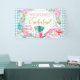 Sweet Alice in wonderland themed birthday banner for a first birthday party. This design features a large mad hatter's hat and various items from the story on a blue diamond pattern background. The design also features a removable faux gold onederful text image.
