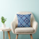 Throw pillow with a large print of diamond shapes in various shades of blue.