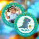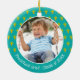 This personalized photo ornament is a wonderful keepsake for your favorite preschool grad or their family members. The front boasts a whimsical and playful visual of a cute, bold, kawaii, navy blue t-rex, and fun, handwritten typography over a light turquoise blue and white striped background. An adorable palm tree pattern overlaying turquoise blue is on the rim, framing the illustration. On the back is the photo of your choice. Personalize the custom text with your grad’s name and class year. Personalize the custom text with your graduate’s name and special message. Choice of ceramic, metal, glass or premium metal frame materials and a circle or square shape. Matching invites, banners, paper plates and napkins, stickers and other graduation goodies are also available in this cool and special collection. Guaranteed to preserve cherished memories of this special occasion!