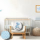This cute cushion for a baby or child’s room can be displayed either side. A geometric design one side gives a modern flair and the other features a friendly dinosaur with customisable wording.