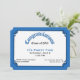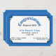 Stylish graduation party invitation, done in black, blue, and white, with a certificate diploma look. Blue graphic text, in an arch, at the top reads, Congratulations. The rest of the text is ready to personalise for your graduation party.
