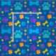 A colourful dog paw print pattern on a blue background. This perfect puppy fabric is just the thing for your pet sewing project.