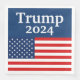 These Donald Trump 2024 presidential campaign party napkins feature a navy blue background with the phrase "Trump 2024" printed in white, classic font. The bottom features an image of the American flag.