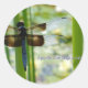This beautiful dragonfly photograph was taken at the Botanical Gardens in Grand Junction, Colorado. The dragonfly is resting on a large blade of grass with its wings extended. Its body is blue and its translucent wings are dark brown at the base and white on the tip. Each wing also has a small black stripe on the top edge towards the tip. There are several blades of green grass behind the dragonfly and the background of the photograph is full of sparkling water reflecting the sun.