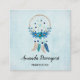 Business cards with a pretty watercolor dreamcatcher. Blue, turquoise and cream colours. Decorated with feathers, beads and flowers.