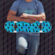 Pictured on a blue dyed background are musical notes