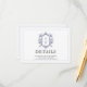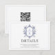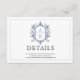 Blue vintage floral crest monogram and border wedding details enclosure card with QR code. This enclosure card showcases a romantic, vintage-inspired design perfect for wedding details. A blue floral crest, artfully incorporating the couple's monogram, takes centre stage. The word "DETAILS" appears below in elegant, matching black typography. There is a thin blue border around it. The reverse side features a convenient QR code for guests to access additional information.