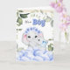 A beautiful illustration of a cute cartoon mother elephant with pink ears clutching her calf to her chest. She has beautiful blue anemone watercolor flowers on her head and is sitting in a blue bouquet of petal leaves framed by a faux gold and eucalyptus leaf frame. The little baby has cute little blue ears and is hugging his moms chest. The words, it's a boy, appears on a white background and the inside has a template for your personalised message.