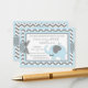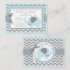 Grey and white chevron print with blue accents with bird perched on elephant with bow-tie and a 3D-look polka-dot bow bring a book card design for a baby shower.