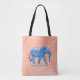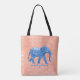 All over print tote bag done in a light coral distressed pattern, with graphics of a blue elephant. Blue text reads pachyderm and can be personalised to read what you want.