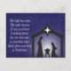 This modern design features a dark blue background with swirl watermarks, a silhouette of the nativity showing Joseph and Mary looking over baby Jesus in the manger. The front of the card reads: The light has come The night departs A star proclaims to seeking hearts the time has come to remember when Lord Jesus was born in Bethlehem. The back of the card has space for a personal message.