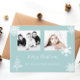 Send warm wishes in style with this flat Christmas card featuring two personalised family photos set against a soft blue background adorned with white snowflakes and a minimalist Christmas tree illustration. The front includes a Merry Christmas greeting and your family name, while the back can be customised with your own holiday message. A perfect winter-themed design for sharing joy with friends, family, and coworkers.