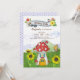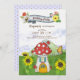 A whimsical and magical kids birthday invite featuring a wonderful green woodland landscape where cute little creatures and birds live in mushroom houses and scamper about in sunflower meadows. Welcome all your child's friends to his mushroom house fantasy land. Perfect for a fantasy garden themed Birthday Party! In this versatile design, the background colour on the front of the card can be customised as per your requirement. The back side features a cute gold polka dotted design on a light blue colour editable background.