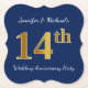 This coaster design features the ordinal number "14th" with a faux gold-like appearance. It also features custom names, and a blue background. It could be used at a party for a married couple celebrating their fourteenth wedding anniversary.