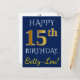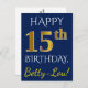 This simple, personalised birthday postcard design features the message "HAPPY 15th BIRTHDAY", with the "15th" having a faux gold-like appearance. The front also features a customised name, and a blue background. The back features a custom birthday greeting message, along with the customisable address of the birthday postcard recipient. It could be sent to somebody who is celebrating their fifteenth birthday. [~Z0000074]