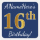 Blue, Faux Gold 16th Birthday + Custom Name Square Sticker