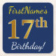 Blue, Faux Gold 17th Birthday + Custom Name Square Paper Coaster