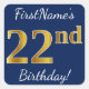 Blue, Faux Gold 22nd Birthday + Custom Name Square Sticker