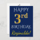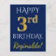 This simple, personalised birthday postcard design features the message "HAPPY 3rd BIRTHDAY", with the "3rd" having a faux gold-like appearance. The front also features a customised name, and a blue background. The back features a personalised birthday greeting message, along with the customisable address of the birthday postcard recipient. It could be sent to somebody who is celebrating their third birthday. [~Z0000074]