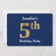 This invitation design features the ordinal number "5th" with a faux gold-like appearance. It also features a customised name, and a blue background. It could be used to invite people to somebody’s fifth birthday party.