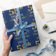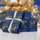This wrapping paper design features a message like "HAPPY 58th BIRTHDAY", with the "58th" having a faux/imitation gold appearance. It also features a name that can be customised, and a blue coloured background. It could perhaps be used when wrapping gifts being given for somebody’s fifty eighth birthday. [~Z0000135]