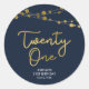 This elegant 21st birthday round sticker feature strings of lights and the word "Twenty One" in faux gold against a dark blue background. Check out other matching items here https://www.zazzle.com/collections/strings_of_lights_faux_gold_celebration_collection-119311942951401241?rf=238364477188679314
