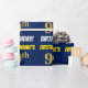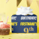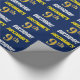 This wrapping paper design features a message like "FIRSTNAME’S 9th BIRTHDAY!", with the "9th" having a faux/imitation gold-like colour appearance, and with the name and "BIRTHDAY" in a fun, bold font. The name can be personalised, and the background is coloured blue. Wrapping paper like this could perhaps be used when wrapping birthday gifts being given to somebody in celebration of their ninth birthday. [~Z0000209]
