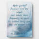 This beautiful tabletop plaque has a closeup image of a light blue feather against a blurred background of pastel colours, and a quote by St. Francis De Sales: Make yourself familiar with the angels and behold them frequently in spirit; for without being seen, they are present with you.