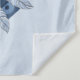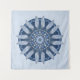 A beautiful feather mandala design tapestry in shades of blue and grey. Feathers and stones are repeated in a geometric pattern, placed on a background of concentric circles in shades of blue. Original art with hand drawn effect.